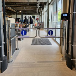 Cancela de saída com abertura automática por leitor de códigos de barras de recibos de compras em lojas e supermercados.
