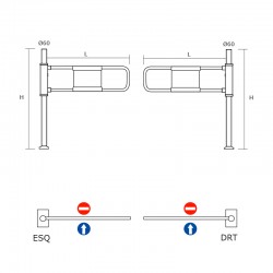 Cancela dupla mecânica com abertura manual, para limitar e controlar o fluxo de pessoas em espaço comerciais, lojas e supermercados.