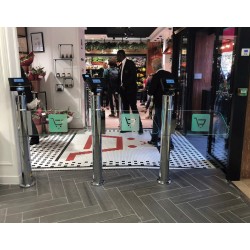 Cancela automática com abertura por radar para limitar e controlar o fluxo de pessoas em espaço comerciais, lojas e supermercados.