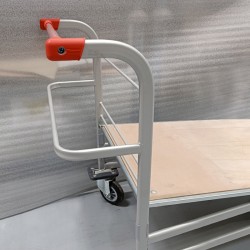 Carrinho de compras com plataforma inferior de madeira. Permite adaptar cesto em arame e lista de compras.