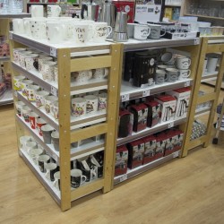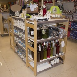 Conjunto de quatro estante de madeira H970 com 4 prateleiras amovíveis cada. Sistema modular adequado para equipar espaços comerciais: lojas de decoração, animais, supermercado, comércio gourmet e bio.