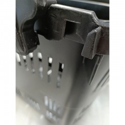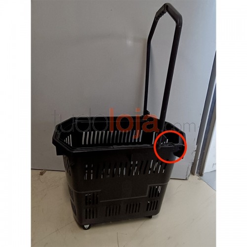Cesto de compras horizontal com duas pegas e 4 rodas.