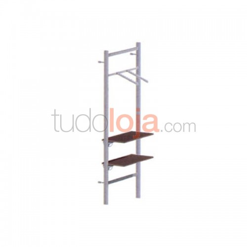 Estante mural RK com 2 prateleiras laminado BRANCO, barra de carga ALUMÍNIO e 2 ganchos inclinados em CROMADO, ideal para lojas de roupa. |